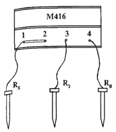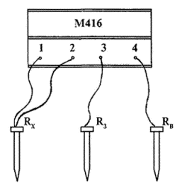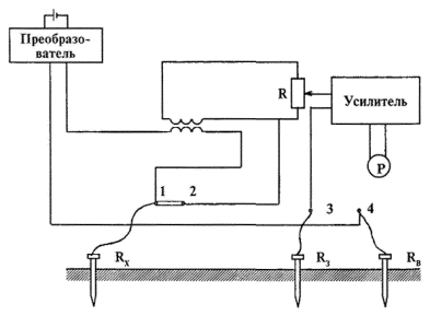 4.2. Измерение сопротивления заземляющих устройств прибором М416Принцип действия прибора основан на компенсационном методе измерения. Структурная схема прибора приведена на рис. 4. Переменный ток от преобразователя через первичную обмотку трансформатора, токовые зажимы 1 и 4 прибора поступает во внешнюю цепь. Вторичная цепь прибора подключена к резистору R, с помощью которого производится компенсация напряжения на измеряемом сопротивлении. При такой схеме включения на измерительное устройство (усилитель, детектор и индикатор «Р») подается разность напряжений на резисторе R и на измеряемом сопротивлении. В момент компенсации (равенства сравниваемых напряжений) ток в цепи индикатора будет равен нулю. Прибор снабжен шкалой, позволяющей непосредственно определить значение измеряемого сопротивления. Пределы измерения прибора М416 от 0,1 до 1000 Ом, изменение пределов измерения осуществляется переключателем путем включения параллельно с резистором R сопротивлений, величина которых зависит от предела измерений. Предел измерения прибора разбит на 4 диапазона: 0,1 - 10; 0,5 - 50; 2 - 200; 10 - 1000 Ом. Основная погрешность прибора сохраняется в пределах паспортных данных при сопротивлениях вспомогательного заземлителя и зонда не более: 500 Ом в диапазоне измерений 0,1 - 10 Ом; 1000 Ом - 0,5 - 50 Ом; 2500 Ом - 2 - 200 Ом; 5000 Ом - 10 - 1000 Ом. Источником питания прибора служат три последовательно соединенных сухих элемента типа «373» (1,5 В). Измерение прибором может производиться как по трехзажимной схеме (рис. 5, измерение сопротивлений более 50 Ом), так и по четырехзажимной (рис. 6, измерение сопротивлений менее 50 Ом). При измерениях по трехзажимной схеме между клеммами 1 - 2 ставят перемычку, При этом сопротивление провода от клеммы 1 до Rx вносит погрешность в измерения. При измерениях по однолучевой схеме расстояние от заземлителя до зонда (Rз) должно быть не менее 5D + 20 м, где: D - наибольшая диагональ сложного заземлителя (для простого заземлителя D = 0), а от зонда до вспомогательного электрода не менее 20 м для сложного заземлителя и 10 м - для простого. При сопротивлении электродов, используемых в качестве вспомогательного заземлителя и зонда, больше вышеуказанных, его необходимо уменьшить путем увлажнения грунта в месте их забивки (вворачивания) или использовать вместо одного несколько соединенных между собой электродов. Измерение сопротивления электродов проводится по двухзажимной схеме (рис. 10) независимо от типа используемого прибора (М416, Ф-4301-М1). Рис. 4. Структурная схема прибора М416 Рис. 5. Измерение больших сопротивлений R > 50 Ом Рис. 6. Измерение малых сопротивлений R < 50 Ом Порядок измерений следующий: установить переключатель в положение «Контроль 5 Ом», нажать кнопку и вращением ручки «Реохорд» добиться установки стрелки индикатора на нулевую отметку, на шкале при этом должно быть показание 5 ± 0,3 Ом; собрать схему измерения; переключатель диапазонов установить в положение «XL», нажать кнопку и вращением реохорда установить стрелку на нуль. Если измеряемое сопротивление более 10 Ом, выбрать другой предел измерений. Для точного измерения очень малых сопротивлений заземлителя может быть использован метод «амперметра-вольтметра», схема которого представлена на рис. 7. При этом Этот метод требует наличия постороннего источника напряжения или сети 220/380 В, что ограничивает возмо