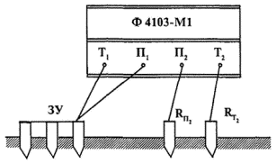 При измерении сопротивления одиночных вертикальных заземлителей длиной до 6 метров следует применять схемы расположения электродов, изображенные на рис. 3, с указанными между ними расстояниями. Для заземлителей длиной свыше 6 метров расстояние между электродами следует принимать не менее 3l, где l - длина вертикального заземлителя. Относительная погрешность измерения, обусловленная уменьшенными расстояниями между электродами при измерениях по схемам, приведенным на рис. 3, не превышает 5 %. Направление разноса электродов нужно выбирать таким образом, чтобы электроды не оказались ближе 10 м от подземных металлических конструкций (кабели, трубопроводы, заземлители опор ВЛ и т.п.). В некоторых случаях при наличии большого количества подземных коммуникаций может потребоваться несколько измерений при различных направлениях лучей и различных расстояниях «а» и «b». Из нескольких измеренных значений в качестве действительного значения принимают наихудший результат. Рис. 1. Схемы расположения электродов при измерении сложных заземлителей (двухлучевая схема) Рис. 2. Схемы расположения электродов при измерении сложных заземлителей (однолучевая схема) Рис. 3. Схемы расположения электродов при измерении одиночных вертикальных заземлителей где: Rx - испытываемый заземлитель; Rв - вспомогательный заземлитель (токовый электрод); Rз - зонд (потенциальный электрод); b ³ 3L (L - длина вертикального заземлителя). Для некоторых приборов указанные расстояния могут отличаться от приведенных, что указано в данной Методике (п. 4.2; 4.3). Полный комплект принадлежностей для производства работ по замерам сопротивления заземлителя (П4126М) должен состоять: - 4 - 6 электродов (Rв и Rз), заостренных с одного конца или со спиралью типа «буравчик», а со второго конца - с поперечными рукоятками для ввертывания их в грунт, а также с болтами и гайками-барашками; - два барабана гибкого медного провода типа ПВГ (ПВ-2) сечением 1,5 - 2,5 мм2 и длиной 100 - 120 м; - гибкий провод типа ПВГ (ПВ-2) - 5 - 10 метров для подсоединения измерителя к заземлителю; - рулетка 10 - 20 метров; - молоток или кувалда весом 2 - 5 кг; - напильник для зачистки контактов. Электроды вворачиваются или забиваются в плотный грунт (не насыпной) на глубину не менее 0,5 метра. В грунтах с большим удельным сопротивлением (например, песок) места, где нужно забивать вспомогательные заземлители, уплотняют или увлажняют водой, раствором соли или кислоты. Количество штырей в измерительном (вспомогательном) электроде Rв зависит от удельного сопротивления поверхностного слоя земли. В сухих, песчаных и мерзлых грунтах может потребоваться несколько соединенных электродов. Для устройства потенциального электрода (зонда Rз) в большинстве случаев достаточно одного штыря. При измерении сопротивления заземления опор линии электропередачи, соединенных между собой грозозащитным тросом, последний должен отсоединяться от испытываемой опоры. Сопротивление заземлителя не должно превышать нормируемого значения в любое время года. Для получения максимально возможного значения на протяжении года (при наибольшем промерзании почвы зимой и высыхании летом) измеренные значения сопротивления должны быть умножены на поправочный коэффициент К, т.е. расчетное значение сопротивления заземлителя определяется из выражения: R = Rизм × К. Учитывая, что ПТЭЭ