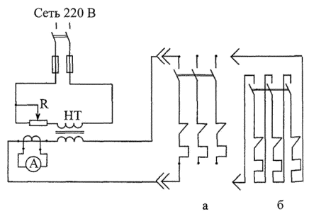 Использование двух последовательно соединенных РН в схеме рис. 31б необходимо для обеспечения плавности регулировки тока вторичной обмотки, так как дискретность изменения тока при использовании одного РН превышает 1А, что не позволяет точно установить требуемый испытательный ток.