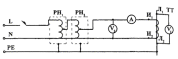 Рис. 30б. Схема измерений для проверки коэффициента трансформации трансформаторов тока методом измерений напряжений
