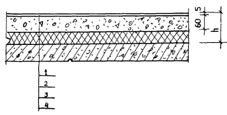 Рис. 5. Пол из линолеума по стяжке из мелкозернистого поризованного бетона в перекрытиях над неотапливаемыми подвалами: 1 - линолеум (ГОСТ 7251-66, ГОСТ 14632-69) на холодной мастике толщиной 5 мм; 2 - стяжка из поризованного бетона марки «50» объемной массой 1200 кг/м3, толщиной 50 мм; 3 - прокладка (засыпка) теплоизоляционная сплошная; 4 - панель перекрытия