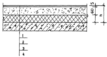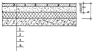 Рис. 6. Пол из керамических плиток в перекрытиях над неотапливаемыми подвалами: 1 - керамические плитки (ГОСТ 6787-69, ГОСТ 6140-70) на цементно-песчаном растворе марки «150» толщиной 25 мм; 2 - стяжка из мелкозернистого поризованного бетона марки «100» толщиной 40 мм; 3 - прокладка (засыпка) теплоизоляционная сплошная; 4 - панель перекрытия