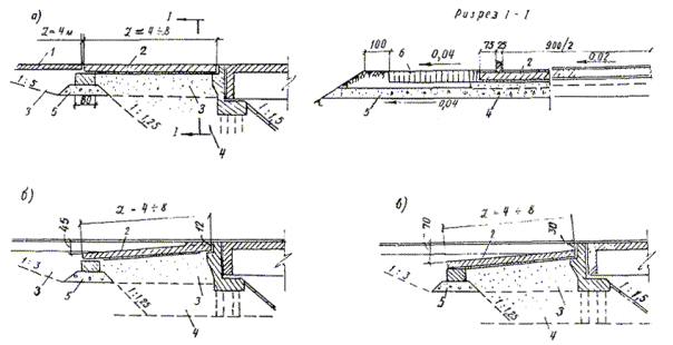Конечную осадку основания насыпи для грунтов, уплотняющихся под весом насыпи, рассчитывают в соответствии с «Методическими указаниями по проектированию земляного полотна на слабых грунтах» (М., Оргтрансстрой, 1968). Для грунтов, не уплотняющихся под весом насыпи, осадку основания можно рассчитывать по упрощенному способу инж. В.Д. Квасова (приложение 1). Через год после отсыпки земляного полотна осадку тела насыпи можно принимать 50 %, а основания - 75 % от полной. 1.8. Длину переходных плит назначают исходя из допустимых углов перелома профиля (п. 1.2) при опускании конца переходной плиты на величину суммарной осадки тела насыпи и ее основания, оставшейся по истечении года после отсыпки. Расчетную суммарную осадку можно снизить при учете осадки фундамента устоя, возводимого на естественном основании из грунтов повышенной сжимаемости с условным сопротивлением до 3 кгс/см2. Для естественных оснований из малосжимаемых грунтов и для свайных оснований осадку фундамента устоев можно не учитывать. 2. Конструкции сопряжений2.1. В конструкцию сопряжений входит часть земляного полотна за береговой опорой моста (отсыпаемая из дренирующего грунта), заканчивающаяся объемлющим опору конусом. Дорожное покрытие в этом месте устраивают из переходных плит. 2.2. В зависимости от типа покрытия, устраиваемого на подходах к мосту, применяют три типа переходных плит: при цементобетонном покрытии - поверхностные плиты (рис. 1, а), при асфальтобетонном - полузаглубленные и заглубленные (рис. 1, б, в). 2.3. Полузаглубленные плиты применяют при асфальтобетонных покрытиях, устраиваемых на жестком и полужестком основаниях. К жесткому относится цементо-бетонное основание, к полужесткому - основание из каменных материалов, укрепленных цементом, гранулированным доменным шлаком, молотым шлаком, золой уноса и др. 2.4. Заглубленные плиты укладывают при асфальтобетонных покрытиях, устраиваемых на нежестких основаниях из каменных материалов различной прочности, а также шлакового щебня, обработанных органическими вяжущими в установке или на месте производства работ. Рис. 1. Конструкции сопряжения моста с насыпью для цементобетонных покрытий (а) и для асфальтобетонных - полузаглубленные плиты (б), заглубленные (в): 1 - промежуточная плита; 2 - переходная плита; 3 - крупно- и среднезернистый песок; 4 - дренирующий грунт; 5 - гравийно-щебеночная подушка; 8 - укрепленный грунт или асфальтобетон 2.5. Расстояние от поверхности покрытия до верха переходной плиты у опирания ее на шкафную стенку (а) и на конце плиты (б) принимают по табл. 2. Во избежание расстройства деформационного шва переходная плита со стороны устоя должна опираться не на верх шкафной стенки, а на ее прилив (см. рис. 1). 2.6. Длину переходных плит назначают в зависимости от ожидаемых осадок тела и основания насыпи. При недостатке данных о физико-механических характеристиках грунтов в основании насыпи длину переходных плит принимают ориентировочно по табл. 3. Таблица 2