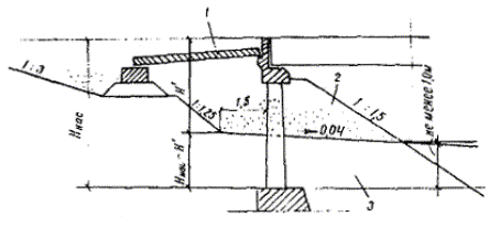 Примечания: 1. Длина переходных плит рассчитана при величинах осадок на второй год после отсыпки насыпи. Осадка тела насыпи принята 0,15; 0,20 и 0,28 % Ннас (соответственно для Ннас = 4; 6; 8 м), основания насыпи - 0,6 % Ннас (малосжимаемые грунты) и 1,0 % Ннас (грунты повышенной сжимаемости). Допускаемые углы перелома профиля соответствуют п. 1.2. 2. К малосжимаемым грунтам относятся скальные, крупнообломочные и песчаные грунты, твердые и полутвердые супеси, суглинки и глины с коэффициентом консистенции менее 0,25; к грунтам повышенной сжимаемости - супеси, суглинки и глины с коэффициентом консистенции более 0,25. 2.9. Поверхности переходных плит и лежня, соприкасающиеся с землей, должны быть покрыты обмазочной гидроизоляцией. 2.10. Часть насыпи за устоями и конусы отсыпают из дренирующего грунта, сопряжение которого с грунтом тела насыпи не должно быть круче 1:1,25 с максимальным размером по низу насыпи при опорах сплошного типа (массивные устои, устои с заборной стенкой и др.) 2,0 м, а при устоях сквозного типа 1,5 м. 2.11. Сопряжение моста с насыпью следует конструировать так, чтобы гравийно-песчаная подушка под лежнем переходной плиты всей своей шириной опиралась на дренирующий грунт (рис. 2, а), либо на насыпь ниже глубины промерзания (рис. 2, б, в). 2.12. В районах недостаточного увлажнения, где средняя многолетняя сумма осадков (период наблюдений не менее 20 лет) за сентябрь и октябрь не превышает 50 мм, а также для песчаных насыпей подушка под лежень может опираться выше глубины промерзания (рис. 2, г). Рис. 2. Схема общей компоновки узла сопряжения моста с насыпью: 1 - дренирующий грунт; 2 - грунт насыпи; hпром - глубина промерзания грунта В этих районах для предварительно уплотненных насыпей, имеющих высоту более 3 - 4 м, допускается снижение объема дренирующей засыпки (рис. 3). При этом толщина дренирующей засыпки от верха покрытия для III дорожно-климатической зоны H¢ = 2/3 ´ Hнас £ 4 м и для IV - V зон H¢ = 2/3 ´ Hнас £ 3 м. Снижение объема дренирующей засыпки необходимо учитывать при расчете береговых опор на горизонтальное давление грунта насыпи. 2.13. Для устройства дренирующей засыпки за опорами и конусов применяют грунты и материалы, не увеличивающиеся в объеме при замерзании: крупный и средний песок, мелкий непылеватый песок (частиц менее 0,1 мм не более 25 %), металлургический шлак. Коэффициент фильтрации дренирующего грунта после уплотнения до величины 0,98 должен быть не менее 2 - 3 м/сутки. Рис. 3. Схема устройства дренирующей засыпки на мостах в районах недостаточной влажности: 1 - переходная плита; 2 - дренирующий грунт; 3 - грунт насыпи 2.14. Дорожное покрытие и обочины земляного полотна на протяжении длины переходных плит плюс 4 м должны быть водонепроницаемыми, что обеспечивается: а) для асфальтобетонного покрытия - укладкой двух слоев асфальтобетона общей толщиной 7 см («Рекомендации по устройству асфальтобетонных покрытий повышенной водонепроницаемости на мостах». Союздорнии, М., 1966); б) для цементобетонного покрытия - изготовлением верхней (монолитной) части плиты из бетона повышенной плотности с воздухововлекающими, газообразующими или уплотняющими добавками, вводимыми с водой затворения, согласно ВСН 85-68; в) для обочин - укладкой асфальтобетона или грунта, обработанного вяжущим. В районах недостаточного увлажнения (п. 2.12) обочины не укрепляют. 2.15. При расположении моста на вогнут