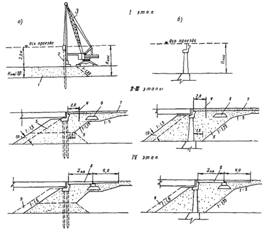 2.19. Технико-экономическая эффективность применения рекомендуемых типов сопряжений мостов и путепроводов с насыпью характеризуется экономией приведенной стоимости на мост в среднем 2,8 тыс. руб. за счет снижения себестоимости перевозок и эксплуатационных затрат, а также экономии материала береговых опор. Коэффициент эффективности и срок окупаемости сопряжений превосходят нормативные значения, что свидетельствует о высоких технико-экономических показателях этих конструкций. 3. Технология строительства3.1. Для обеспечения строительства земляного полотна по всей трассе без разрывов и во избежание неравномерных осадок основания насыпи на подходах к мосту необходимо: а) сооружать береговые опоры моста или путепровода с опережением возведения насыпи на подходах; б) уплотнять насыпь на подходах к мосту одновременно с устройством дренирующей засыпки за опорами и конусов. Строительство береговых опор в разрывах земляного полотна допускается при надлежащем технико-экономическом обосновании. При этом размеры разрыва должны быть не менее 2 - 3 высот насыпи в каждую сторону от моста. Грунт для засыпки разрыва (за пределами дренирующей засыпки) должен быть однороден грунту прилегающей насыпи. 3.2. Строительство сопряжения является частью комплекса по возведению береговых опор моста с насыпью и включает следующие работы: а) подготовительные работы: в необходимых случаях в соответствии с проектом производят усиление грунтов основания механизированным уплотнением, заменяют слабые грунты, устраивают вертикальные песчаные дрены или дренажные прорези (п. 3.10); б) возведение береговых опор; в) отсыпку участков земляного полотна на подходах к мосту с одновременной отсыпкой дренирующего грунта за опорами и конусов; устройство гравийно-щебеночных подушек под лежень и дренажных слоев под переходными плитами; г) монтаж сборных или устройство сборно-монолитных оголовков опор и конструкций сопряжений; д) установку береговых пролетных строений; омоноличивание швов; устройство изоляции и деформационных швов; е) укладку покрытия на подходах к мосту и на его береговых пролетах; ж) устройство поверхностного водоотвода возле моста и лестничных сходов; з) срезку конусов до их проектного очертания, укрепление конусов и обочин земляного полотна возле моста. В зависимости от типа береговых опор (козловые или стоечные на свайном или естественном основаниях; свайные козлового или вертикального типа) последовательность строительных работ может меняться. 3.3. Применение свайных опор позволяет лучше уплотнить грунты насыпи и конусов и сократить разрыв между сроком окончания сооружения земляного полотна и сроком строительства моста за счет отсыпки нижней части насыпи из дренирующего грунта до забивки свай. 3.4. Сопряжения строят в четыре этапах): х) Подробнее см. «Технологические карты на обратную засыпку, разравнивание и уплотнение грунта в сопряжении земляного полотна автомобильных дорог с мостами и путепроводами», разработанные в 1975 г. ЦНИИОМТП Госстроя СССР. I этап. При свайных опорах (рис. 5, а) отсыпают призму из дренирующего грунта с послойным уплотнением до коэффициента 0,98 - 1,0 и забивают с нее сваи береговой опоры. При высоте насыпи Ннас = 3 м высоту призмы принимают равной (Ннас = 2 м); при Ннас = 4 ¸ 6 м высота призмы - (Ннас = 3 м). При высоте насыпи б