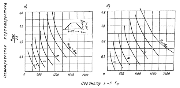 где A - параметр, кгс/см, зависящий от геометрических характеристик насыпи (высоты Hнас и средней ширины - 2b) и объемной массы грунта g; определяется по рис. 1; Еср - средневзвешенный модуль деформации грунтов основания в пределах активной зоны, кгс/см2, определяемый по формуле