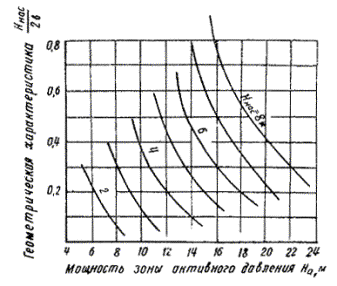 где Е1, Е2, ..., Еn - модули деформаций слоев грунта, определяемые компрессионным испытанием отобранных проб грунта; h1, h2, ..., hn - толщина однородных слоев грунта, см, в пределах активной зоны На, определяемой по рис. 2. Пример. Насыпь высотой Ннас = 3,8 м имеет ширину поверху В = 10 м и откосы 1:1,5. Объемная масса грунтов насыпи g = 1,65 т/м3. Основание насыпи до глубины 2,6 м сложено суглинком твердопластичным (Е = 60 кгс/см2), подстилаемым до глубины 7,3 м супесью пластичной (Е = 90 кгс/см2). Ниже этих грунтов залегают твердопластичные суглинки (Е = 110 кгс/см2). Рис. 1. Зависимость параметра А (относительной осадки основания) от геометрических характеристик насыпи: а - при объемной массе грунтов основания g =1,5 т/м3; б - то же при g =2 т/м3; Ннас - высота насыпи; 2в - средняя ширина насыпи Рис. 2. Мощность активной зоны На в основании насыпи в зависимости от ее геометрических характеристик Определяем геометрическую характеристику