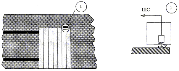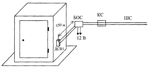 БОС - блок приема и обработки сигнала ДСВ1 - датчик сигналов вибрации Максимальная площадь, контролируемая одним ДСВ1 металлического шкафа (сейфа) - не менее 8 м2 по внешней его поверхности Вариант 3. Блокировка сейфа извещателем поверхностным вибрационным В горизонтальной плоскости