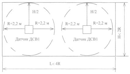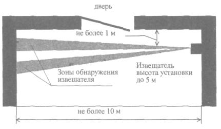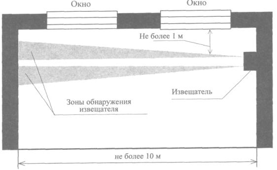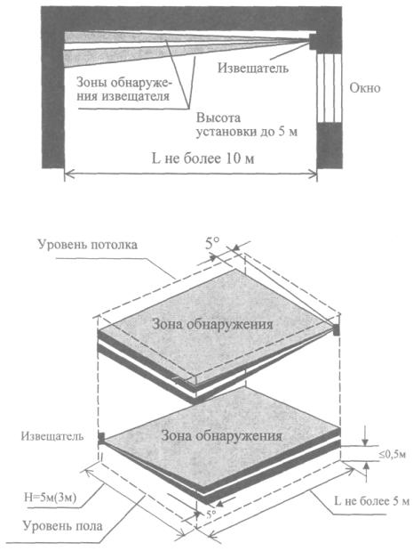 Н - высота установки извещателя при высоте пололка: до 3 м - под потолком не более 0,5 м; от 3 до 5 м - не более 1 м от потолка; от 5 м и выше - не более 2 м от потолка