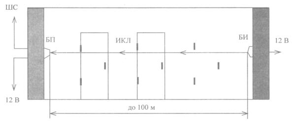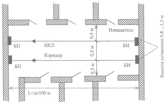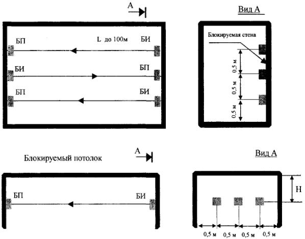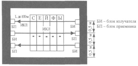 БП - блок приемника БИ - блок излучателя ИКЛ – инфракрасный луч Вариант 5. Блокировка нескольких дверей на открывание и проникновение извещателем активным линейным оптико-электронным В горизонтальной плоскости