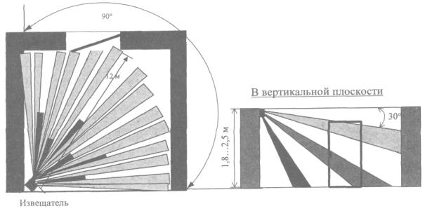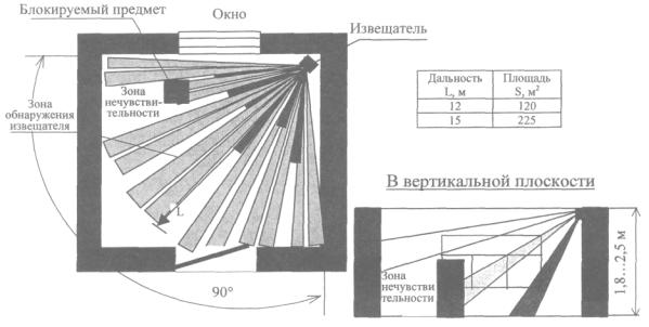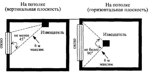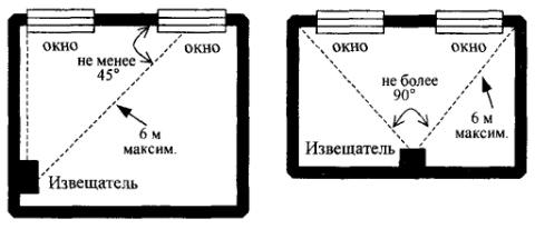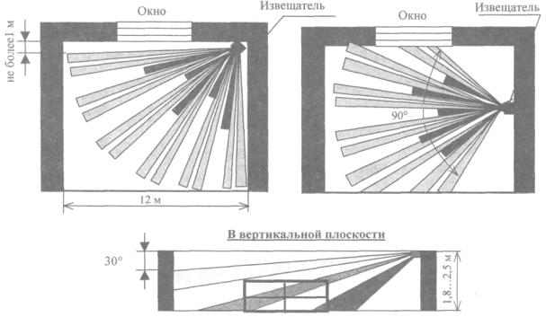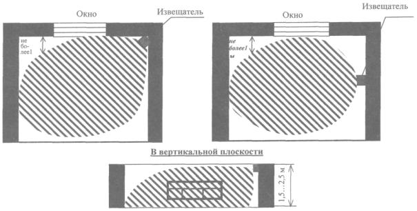 Вариант 2 Блокировка оконных проемов на проникновение извещателем поверхностным оптико-электронным с объемной зоной обнаружения при установке его в углу помещения или на стене В горизонтальной плоскости