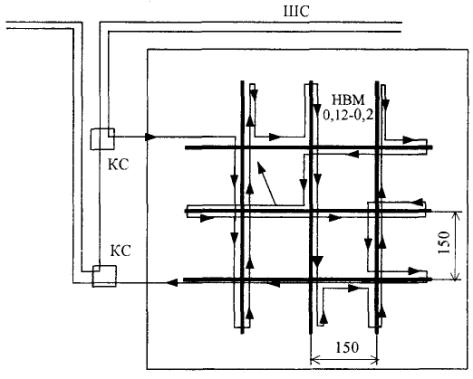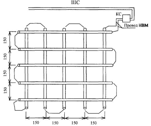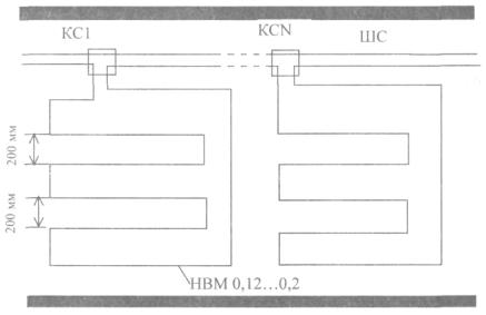 KC1-KCN - коробки соединительные. Устанавливаются через каждые 5 м2 блокируемой поверхности Вариант 1. Блокировка стен, пола и потолка проводом на разрушение Блокируемая стена (вид сверху)