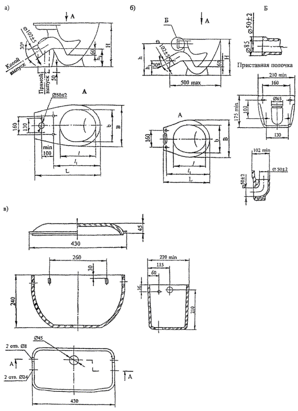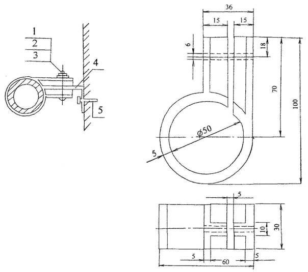1 - винт; 2 - гайка М5; 3 - шайба 5; 4 - полоса 25´3; 5 - дюбель-гвоздь Рисунок 9 - Схема полиэтиленового кронштейна Кр50 для крепления пластмассовых труб Дн50 1 - 4 - полоса 4´30; 5 - гайка М6; 6 - шайба 6; 7 - болт М6´30; 8 - пластина резиновая толщиной 3 мм; 9 - круг Рисунок 10 - Схема крепления пластмассовых трубопроводов канализации к конструкциям здания. 3 ТРЕБОВАНИЯ К КАЧЕСТВУ И ПРИЕМКЕ РАБОТ3.1 При производстве работ по монтажу внутренних систем канализации жилых и общественных зданий необходимо вести строгий контроль качества применяемых материалов, изделий и оборудования, соблюдения технологии выполнения работ и ухода за законченными работами. 3.2 Контроль качества работ по монтажу внутренних систем канализации выполняют в соответствии с требованиями СНиП 3.01.01-85* «Организация строительного производства» и СНиП 3.05.01-85 «Внутренние санитарно-технические системы». 3.3 Производственный контроль качества работ должен включать входной контроль рабочей документации, изделий, материалов и оборудования, операционный контроль отдельных строительных процессов и производственных операций и приемочный контроль работ по монтажу внутренних систем канализации. 3.4 При входном контроле рабочей документации должна производиться проверка ее комплектности и достаточности содержащейся в ней технической информации для производства работ. При входном контроле перед началом монтажа производится контроль качества применяемых материалов, трубных заготовок, сантехприборов, измерительных инструментов, при котором внешним осмотром устанавливается соответствие их требованиям стандартов или других нормативных документов и рабочей документации, а также наличие и содержание паспортов, сертификатов и других сопроводительных документов. 3.6 Результаты входного контроля должны быть занесены в «Журнал входного учета и контроля качества получаемых деталей, материалов, конструкций и оборудования». 3.7 При операционном контроле проверяют все операции по монтажу внутренних систем канализации жилых и общественных зданий в соответствии с требованиями СНиП 3.05.01-85 «Внутренние санитарно-технические системы». 3.8 Трубопроводы должны быть прочно закреплены на строительных конструкциях зданий или плотно лежать на опорах. Сварные стыки трубопроводов не должны находиться на опорах. 3.9 В сварном шве не должно быть трещин, раковин, пор, подрезов, а также пережогов и подтеков наплавленного металла. 3.10 В жилых домах и общественных зданиях расстояние от поверхности штукатурки или облицовки до оси неизолированных стояков при их открытой прокладке должно составлять при диаметре труб до 32 мм - 35 мм и при диаметре труб от 40 до 50 мм - 50 мм с допускаемым отклонением +5 мм. 3.11 Вертикальность стояков пластмассовых трубопроводов устанавливается уровнем и отвесом. Отклонение от вертикали при открытой прокладке допускается не более 2 мм на 1 м длины трубопровода. 3.12 Уклоны трубопроводов должны быть направлены в сторону водоспускных устройств. Трубопроводы водоснабжения разводящие и подводки к приборам прокладываются с уклоном 0,002 - 0,005 для возможности спуска из них воды. В низших точках сети устраиваются спускные устройства. 3.13 Высота установки санитарных приборов от уровня чистого пола должна соответствовать размерам, указанным в таблице 1. Допускаемые отклонения высоты установки отдел