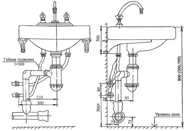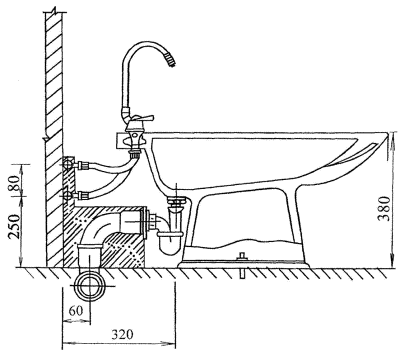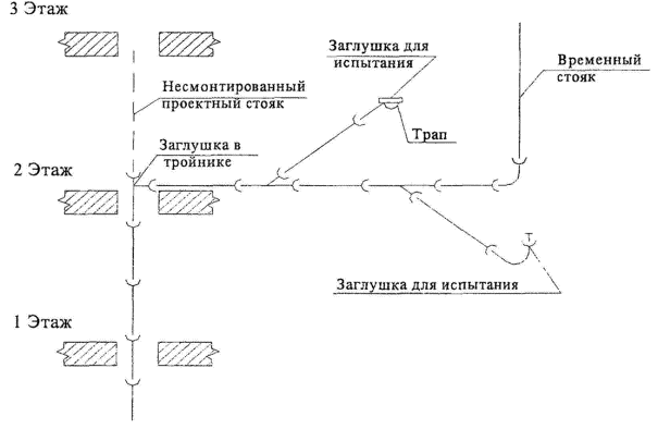 2.12 В период монтажа открытые концы трубопроводов и трапов необходимо предохранять от попадания в них строительного мусора с помощью инвентарных заглушек, полиэтиленовой пленки и т.п. Схемы установки санитарно-технических приборов показы на рисунках 3, 4. Рисунок 3 - Монтажное положение ванны. Примечание - В скобках: 1-ый размер при установке прибора в дошкольных учреждениях, 2-й - в школах. Рисунок 4 - Монтажное положение умывальника. 2.13 Рабочие операции при испытании систем внутренней канализации необходимо осуществлять в следующей последовательности: - наружный осмотр трубопроводов и санитарно-технических приборов; - испытание проливом: наполнение приборов водой и проверка переливных устройств (при наличии); регулировка поплавков (для смывных бачков); спуск воды из прибора; осмотр выпуска прибора, сифона (при наличии), отводящего трубопровода от прибора и участков трубопроводов от нескольких приборов с отметкой мелом мест дефектов (течей). Осмотр участков трубопроводов должен выполняться при одновременном открытии 75 % санитарно-технических приборов, подключенных к проверяемому участку в течение времени, необходимого для его осмотра; - испытание наполнением: установка заглушек на выпуски систем канализации, присоединенные к одному стояку и расположенные на более низком уровне; наполнение трубопроводов водой (из системы постоянного или временного холодного водоснабжения или при помощи специального опрессовочного агрегата) до уровня пола первого этажа (при испытании трубопроводов канализации, проложенных в земле или подпольных каналах); осмотр трубопроводов с отметкой мелом мест дефектов (течей). Продолжительность испытания систем из пластмассовых труб составляет 20 мин; - спуск воды через заглушки с вентилем на выпусках систем канализации до уровня нижнего дефектного места (при испытании наполнением); - устранение дефектов и повторное испытание; - снятие заглушек и спуск воды (по окончании испытаний наполнением). 2.14 Схема гидростатического испытания отводных трубопроводов, проложенных в конструкциях междуэтажных перекрытий, приведена на рисунке 5. Рисунок 5 - Схема гидростатического испытания отводных трубопроводов, проложенных в конструкциях междуэтажных перекрытий. 2.15 Трубопроводы считаются выдержавшими испытания, если при осмотре не обнаружено течи через стенки трубопроводов и места соединений (при испытании проливом или наполнением), а уровень воды в стояках не понизился (при испытании наполнением). 2.16 В зимнее время испытание производится при устойчивой температуре воздуха внутри здания не ниже +5 °С. 2.17 Испытание пластмассовых трубопроводов следует проводить не ранее, чем через 24 ч после выполнения последнего клеевого соединения и не ранее, чем через 2 ч после выполнения последнего сварного соединения. 2.18 По окончании испытаний оставляют акт освидетельствования скрытых работ для трубопроводов, скрываемых при последующих работах (в междуэтажных перекрытиях, в земле и т.п.) согласно обязательному приложению 6 СНиП 3.01.01-85 и акты испытания систем канализации согласно обязательному приложению 4 СНиП 3.05.01-85. 2.19 Схемы узлов соединения и приспособления для крепления трубопроводов канализации даны на рисунках 6 - 10. 1 - фланцы стальные свободные; 2 - втулки приклеенные ПВХ; 3 - труба ПВХ; 4 - прокладка резиновая Рисуно