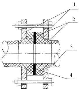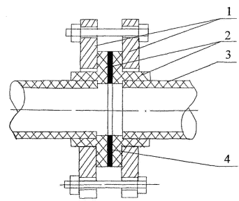 1 - фланцы стальные; 2 - втулки пластмассовые приваренные; 3 - трубка ПВХ; 4 - прокладки резиновые Рисунок 7 - Схема фланцевого соединения, выполненного с помощью приваренных втулок под фланцы