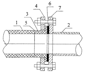 1 - труба пластмассовая; 2 - труба стальная; 3 - патрубок пластмассовый; 4 - фланец стальной, одеваемый на патрубок до выполнения сварного соединения патрубка с трубой; 5 -сварной шов; 6 - резиновая прокладка; 7 - фланец стальной приварной Рисунок 8 - Схема фланцевого соединения пластмассовой и металлической труб