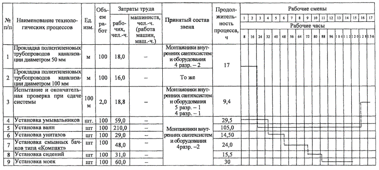 УТВЕРЖДАЮ Генеральный директор, к.т.н. _____________ С.Ю. Едличка «31» мая 2004 ТЕХНОЛОГИЧЕСКАЯ КАРТА НА МОНТАЖ ВНУТРЕННИХ СИСТЕМ 76-04 ТК Главный инженер ______________ А. В. Колобов Начальник лаборатории ____________ Б.И. Бычковский 2004 Карта содержит организационно-технологические и технические решения на монтаж внутренних систем канализации в жилых и общественных зданиях. В технологической карте приведены: область применения, организация и технологическая последовательность выполнения работ, требования к качеству и приемке работ, калькуляция затрат труда, график производства работ, потребность в материально-технических ресурсах, решения по безопасности и охране труда и технико-экономические показатели. Исходные данные и конструктивные решения, применительно к которым разработана карта, приняты с учетом требований строительных норм, правил и стандартов. Технологическая карта является составной частью ППР и может использоваться при строительно-монтажных работах в составе ППР согласно СНиП 3.01.01-85* и предназначается для инженерно-технических работников строительных организаций, производителей работ, мастеров и бригадиров, связанных с монтажом внутренних систем канализации, а также работников технического надзора заказчика. В разработке технологической карты участвовали сотрудники ОАО ПКТИпромстрой: - Артемов А.С. - разработка технологической карты, компьютерная обработка и графика; - Черных В.В. - общее технологическое сопровождение; - Холопов В.Н. - проверка технологической карты; - Бычковский Б.И. -техническое руководство, корректура и нормоконтроль; - Колобов А.В. - общее техническое руководство разработкой технологических карт; - к.т.н. Едличка С.Ю. - общее руководство разработкой технологической документации. СОДЕРЖАНИЕ 1 ОБЛАСТЬ ПРИМЕНЕНИЯ1.1 Настоящая технологическая карта на монтаж внутренних систем канализации в жилых и общественных зданиях предназначена для использования при выполнении работ по устройству внутренних систем канализации, включающих: - монтаж трубопроводов систем внутренней канализации укрупненными узлами из пластмассовых канализационных труб и фасонных частей; - установку санитарно-технических приборов; - испытание систем внутренней канализации. 1.2 При привязке технологической карты к конкретному объекту уточняются объемы работ, калькуляция затрат труда, потребность в материально-технических ресурсах и продолжительность выполнения работ. Согласно СНиП 3.01.01-85* данная карта может быть использована при строительстве зданий и сооружений в составе ППР. 1.3 Форма использования технологической карты предусматривает обращение ее в сфере информационных технологий с включением в базу данных по технологии и организации строительного производства автоматизированного рабочего места технолога строительного производства (АРМ ТСП), подрядчика и заказчика. 2 ОРГАНИЗАЦИЯ И ТЕХНОЛОГИЯ ВЫПОЛНЕНИЯ РАБОТ2.1. До начала монтажа внутренних систем канализации должны быть выполнены следующие работы: - смонтированы междуэтажные перекрытия, стены и перегородки; - устроены траншеи для выпусков канализации до первых от здания колодцев; - выполнены фундаменты или площадки для установки санитарно-технического оборудования; - выполнена подготовка под полы с нанесением на внутренних и наружных стенах всех помещений вспомогательн
