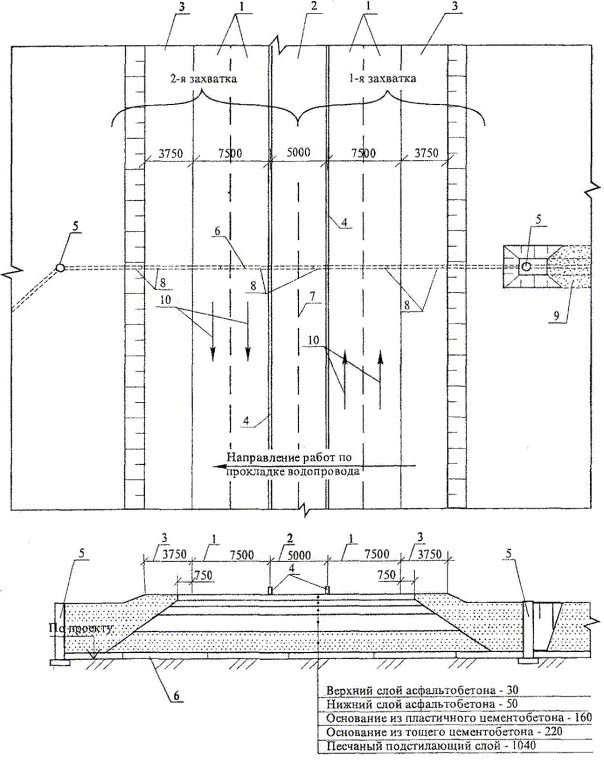 ВОДОПРОВОДА 103-04 ТК Главный инженер ______________ А. В. Колобов Начальник лаборатории ____________ Б.И. Бычковский 2004 Технологическая карта на прокладку стального водопровода через проезжую часть автодорог является обязательным организационно-технологическим документом, регламентирующим правила производства работ по прокладке стального водопровода через проезжую часть автодорог в траншее. В карте приведены указания по организации и технологии укладки наружного водопровода из стальных труб, представлены схемы механизации, а также приведены данные по контролю качества и приемке работ, требования безопасности и охраны труда, экологической и пожарной безопасности при производстве работ. Технологическая карта предназначена для производителей работ, мастеров и бригадиров организаций, производящих прокладку водопровода через проезжую часть автодорог, а также работников технического надзора заказчика и инженерно-технических работников строительных и проектно-технологических организаций. Технологическая карта разработана сотрудниками ОАО ПКТИпромстрой: Самосуд Н.В., Савина О.А. - разработка технологической карты, компьютерная обработка и графика; Бычковский Б.И. - разработка технологической карты, техническое руководство, корректура и нормоконтроль; Черных В.В. - технологическое сопровождение разработки; Колобов А.В. - общее техническое руководство разработкой технологических карт; Едличка С.Ю., к.т.н., - общее руководство разработкой технологической документации. СОДЕРЖАНИЕ 1 ОБЛАСТЬ ПРИМЕНЕНИЯ1.1 Технологической картой предусматривается прокладка стального водопровода из звеньев и отдельных труб в предварительно подготовленных траншеях с креплением стенок через проезжую часть автомобильных дорог, без использования футляров. На рисунке 1 представлена возможная конструктивная схема перехода водопровода через проезжую часть автодороги. 1 - проезжая часть, полосы движения; 2 - разделительная полоса; 3 - обочина; 4 - дорожный барьер; 5 - водопроводные колодцы; 6 - проектируемый переход водопровода; 7 - линия раздела по захваткам; 8 - трубы водопровода; 9 - проложенный участок водопровода; 10 - направление движения автотранспорта Рисунок 1 - Возможная схема перехода водопровода через проезжую часть автодороги 1.2 Технологическая карта, входящая в состав ППР, предназначена для инженерно-технического персонала (прорабов, мастеров) и рабочих строительных организаций, занятых на прокладке водопровода через проезжую часть автодорог, сотрудников технадзора заказчика, осуществляющих надзорные функции за технологией и качеством выполнения работ, а также инженерно-технических работников строительных и проектно-технологических организаций. 1.3 При привязке технологической карты к объекту строительства необходимо учитывать требования СНиП 3.05.04-85* «Наружные сети и сооружения водоснабжения и канализации», СНиП III-42-80* «Магистральные трубопроводы», «Организационно-технологического регламента строительства (реконструкции) объектов в стесненных условиях существующей городской застройки», введенного в действие с 2003 г., и «Правил производства земляных и строительных работ, прокладки и переустройства инженерных сетей и коммуникаций в г. Москве», утвержденных постановлением Правительства Москвы № 603 от 08.08.2000 г (для Москвы). 1.4 Привязка технол