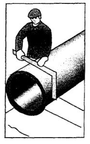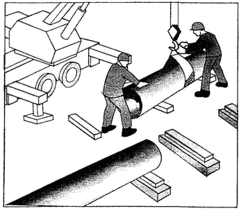 Монтажники Т3 и Т4 натягивают рулетку вдоль оси раскладки звеньев и размечают по ней положение лежней, после чего подносят лежни и раскладывают их по разметке так, чтобы середина лежней совпадала с осью раскладки. По концам крайних лежней забивают четыре стальных стержня и натягивают между ними шпагат на уровне верха крайних лежней. Затем, предварительно сдвинув промежуточные лежни, укладывают их по уровню крайних, срезая или подбивая лопатами грунт под ними. 2.7 Монтажники Т1 и Т2 по рулетке размечают середину трубы. Машинист устанавливает кран-трубоукладчик на расстоянии около 1 м от трубы так, чтобы стрела находилась над центром ее тяжести, и опускает строп-полотенце. Монтажник Т2 стропует первую трубу, и машинист крана приподнимает ее на 20 - 30 см. Убедившись в правильности строповки и надежности действия тормозов, он продолжает подъем на высоту до 1 м, после чего по команде стропующего укладывает трубу на лежни так, чтобы ее стыкуемый конец находился примерно на равном расстоянии от промежуточных лежней. Монтажники, стоя у обоих концов трубы, удерживают ее от разворота. Таким же способом укладывают вторую трубу, Расстояние между краями уложенных труб должно быть в пределах 0,3 - 0,5 м. Схема организации рабочего места при укладке труб на лежни для соединения в звено показана на рисунке 2.
