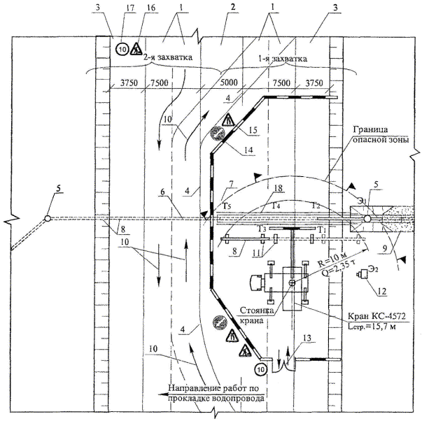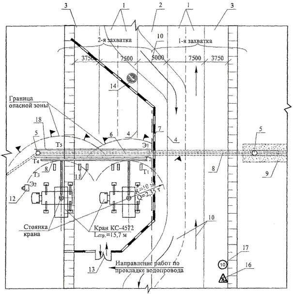 Трубы из низколегированных сталей марок 10Г2С, 09Г2С, 14ХГС, 17ГС и других аналогичных марок с толщиной стенки до 15 мм можно сваривать при температуре воздуха до минус 50 °С электродами с фтористо-кальциевым покрытием без предварительного подогрева. При ветре свыше 10 м/с, а также при выпадении атмосферных осадков производить сварочные работы без инвентарных укрытий запрещается. При перерыве в работе более 2 часов концы свариваемого участка водопровода следует закрыть инвентарными заглушками для предотвращения попадания внутрь трубы снега, грязи и т.п. После окончания сварочных работ наружная изоляция труб в местах сварных соединений должна быть восстановлена в соответствии с проектом. Схема организации рабочего места при укладке звена труб в траншею с использованием автомобильного крана представлена на рисунке 4. 1 - проезжая часть, полосы движения; 2 - разделительная полоса; 3 - обочина; 4 - дорожный барьер; 5 - водопроводные колодцы; 6 - проектируемый переход водопровода; 7 - дорожные тумбы; 8 - трубы водопроводные; 9 - проложенный участок водопровода; 10 - направление движения автотранспорта; 11 - лежни; 12 - сварочный агрегат; 13 - ворота; 14 - импульсная стрелка; 16 - дорожные работы; 17 - ограничение скорости; 18 - ограждение траншеи и участка работ. Т1, Т2, Т3, Т4, Т5, Э1, Э2 - рабочие места исполнителей. Рисунок 4 - Схема организации рабочего места при укладке звена труб в траншею 2.17. После окончания всех монтажных работ, при отсутствии в проекте указаний о способе испытаний, трубопровод испытывается давлением на прочность и герметичность гидравлическим способом (водой или незамерзающими жидкостями). Гидравлическое испытание трубопроводов водой при отрицательной температуре воздуха допускается только при условии предохранения трубопровода от замораживания. Полость трубопровода до испытания должна быть очищена от окалины и шлака, а также от случайно попавших при строительстве внутрь трубопроводов грунта, воды и различных предметов. Испытание трубопроводов следует производить после полной готовности участка или всего трубопровода (полной засыпки, обвалования или крепления на опорах, очистки полости, установки арматуры и приборов, катодных выводов и представления исполнительной документации на испытываемый объект). Испытание трубопроводов осуществляется, в два этапа: - предварительное испытание на прочность и герметичность, которая выполняется после засыпки пазух с подбивкой грунта на половину вертикального диаметра и присыпкой трубы с оставленными открытыми для осмотра стыковыми соединениями, но до закрытия каналов и установки сальниковых компенсаторов, секционирующих задвижек, гидрантов, вантузов, предохранительных клапанов; Предварительное испытание трубопроводов, подлежащих в процессе строительства немедленной засыпке (производство работ в стесненных условиях) при соответствующем обосновании в проектах, допускается не производить. - приемочное (окончательное) испытание на прочность и герметичность, которое выполняется после полной засыпки трубопровода при участии представителей заказчика и эксплуатирующей организации и завершения строительно-монтажных работ, установки всего оборудования тепловых сетей (задвижек, компенсаторов и др.), предусмотренного проектом засыпки траншеи, но до устройства гидрантов, вантузов, предо