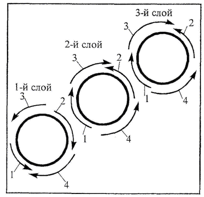 Машинист устанавливает кран-трубоукладчик у середины второй трубы и опускает строп-полотенце. Монтажник Т2 закрепляет строп-полотенце и подает команду машинисту крана приподнять трубу на 0,5 м над лежнями и переместить к месту стыковки. Монтажники Т1 и Т2 укладывают трубу на лежни и центрируют стыки, после чего рихтуют и закрепляют ее, забивая молотком деревянные клинья. Затем они устанавливают на стык наружный центратор и поворотом винтового рычага до отказа закрепляют отцентрированный стык. Электросварщик универсальным шаблоном проверяет величину зазора между торцами стыкуемых труб (1,5 - 2,5 мм по всей окружности стыка). В случае несоответствия величины зазора указанным размерам монтажники винтовым рычагом ослабляют центратор, машинист подъемом крюка делает натяжку стропа, а монтажники при помощи ломов изменяют величину зазора, после чего деревянными клиньями фиксируют положение трубы, и окончательно центрируют стык, затянув рычаг центратора до отказа. 2.9 Порядок наложения шва при сварке труб в звено показан на рисунке 3. Рисунок 3 - Порядок наложения шва при сварке стыка Электросварщики прихватывают стык в нескольких местах, располагая швы на равных расстояниях по окружности. По окончании прихватки монтажники Т1 и Т2 снимают центратор со стыка. Электросварщики сваривают стык трехслойным швом, как показано на рисунке 3, соблюдая установленный режим сварки и зачищая каждый слой шва перед наложением следующего шва. Швы накладывают при двух положениях стыкуемого звена. После наложения сварного шва на четверти окружности трубы с каждой стороны монтажники поворачивают звено труб и закрепляют его на лежнях у стыка, забивая молотком деревянные клинья. Машинист устанавливает кран-трубоукладчик у конца сваренного звена труб и опускает строп-полотенце. По команде монтажника машинист приподнимает звено на высоту 0,5 м, и рабочие удаляют два лежня и подводят под конец звена труб инвентарную подкладку, а машинист крана-трубоукладчика опускает на нее конец звена. Монтажник снимает строп-полотенце. Другой конец звена труб устанавливают на инвентарную подкладку таким же способом, после чего звено считается подготовленным к укладке в траншею. 2.10 Зачистка дна траншеи и приямков на всем протяжении трубопровода производится монтажником Т5 вручную с использованием лопат, ходовой визирки и визирок на бровке траншеи с учетом проектного уклона трубопровода. Толщина срезки недобора грунта определяется по ходовой визирке и визиркам на бровке траншеи. Зачистка должна производиться участками, равными длине трубы (либо звена, если принято такое решение по месту). Недобор грунта из приямков и дна траншеи выбрасывается на бровку, противоположную размещению грузоподъемных механизмов.