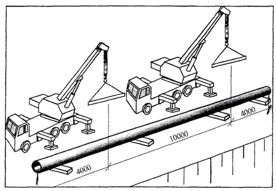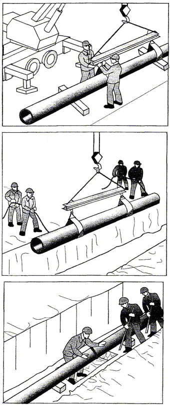 2.11 После зачистки монтажники, по двое на каждом конце звена труб (или отдельных труб), размечают с помощью рулетки места строповки звена (или трубы) для грузоподъемных механизмов. Для перемещения трубы (звена) в проектное положение машинист устанавливает трубоукладчик (либо кран) напротив укладываемой трубы (либо звена) так, чтобы его стрела находилась над серединой трубы либо над отмеченными местами звена, и опускает крюк. Монтажники попарно Т1, Т2 и Т3, Т4 заводят стропы-полотенца под укладываемую трубу и цепляют их за крюки крана, после чего монтажник (сигнальщик) Т1 подает команду машинисту на подъем трубы (звена). Монтажники тем временем снимают распорки крепления траншеи в месте монтажа трубы (звена).