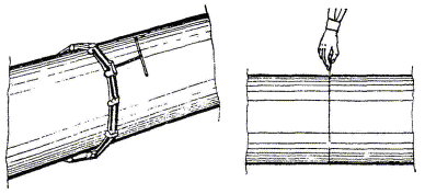 2.14 Выверка положения трубы (звена) производится монтажниками Т1 и Т2, один из которых (Т2) устанавливает на лоток укладываемой трубы (звена) ходовую визирку, а второй монтажник Т1, находясь у передней линии неподвижной визирки обноски, следит за тем, чтобы верх ходовой визирки находился на линии визирования. При необходимости он подает сигнал машинисту приподнять или опустить трубу (звено), а монтажники Т3 и Т4 срезают или подбивают грунт под трубой (звеном). Затем монтажник Т1 при помощи угольника с уровнем отмечает на концах укладываемого звена (трубы) положение оси трубопровода, а монтажники Т3 и Т4 по отвесу устанавливают на размеченные места вешки. Монтажник Т1, ориентируясь на вешку, установленную на ранее уложенную трубу, проверяет правильность укладки трубы (звена) в плане. При необходимости монтажники Т2, Т3 и Т4 ломами смещают конец трубы (звена) в нужную сторону, после чего производится расстроповка трубы (звена), при этом придерживая трубу (звено) ломами, пока машинист не уведет стрелу.