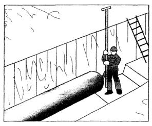 2.12 Машинист после получения команды приподнимает трубу (звено) сначала на 200 - 300 мм и, убедившись в правильности и надежности строповки, поднимает на высоту 1 м и опусканием стрелы направляет трубу (звено) в траншею. Монтажники Т1, Т2, и Т3, Т4, находясь на бровке траншеи, с помощью веревочных расчалок удерживают трубу (звено) от разворота. По команде монтажника (сигнальщика) Т1 машинист опускает трубу (звено), приостановив спуск на расстоянии 0,5 м от дна траншеи. Крепление стенок траншеи условно не показано.