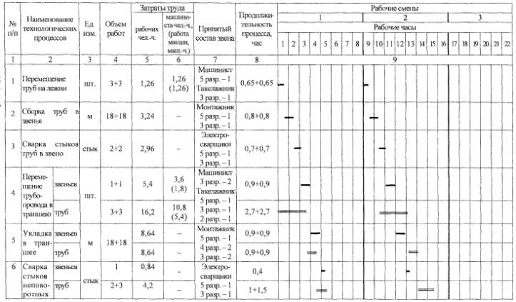 2.5 Работы по прокладке звена труб (или труб) водопровода через проезжую часть автодорог выполняется звеном монтажников наружных трубопроводов в количестве 5 человек следующей квалификации: - монтажник 5 разряда Т1 - 1; - монтажники 4 разряда Т2 и Т3 - 2; - монтажники 3 разряда Т4 и Т5 - 2. При прокладке трубопроводов диаметром 600 мм и более могут быть включены в состав звена монтажник 6 разряда и монтажник 3 разряда по 1 человеку. Сварочные работы выполняет электросварщик 6 разряда, не входящий в состав звена монтажников. 2.6 Раскладка лежней вдоль траншеи для укладки труб и сварки их в звено осуществляется двумя монтажниками Т3 и Т4.