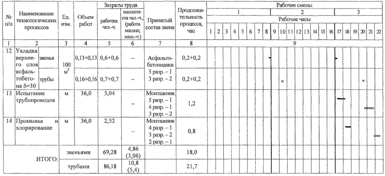 5.2 Расход эксплуатационных материалов для обслуживания машин и механизмов определяется по паспортным данным механизмов. 6 ТЕХНИКО-ЭКОНОМИЧЕСКИЕ ПОКАЗАТЕЛИ6.1 Калькуляция затрат труда и машинного времени и календарный план производства работ составлены на устройство одного перехода водопровода из стальных труб Æ 377 мм длиной 36 м в траншее с креплением стенок через проезжую часть автодорог на глубине 1,5 м с использованием автокрана. 6.2 Затраты труда и машинного времени на укладку труб (звеньев) в траншею через проезжую часть автодорог подсчитаны по «Единым нормам и расценкам на строительные, монтажные и ремонтно-строительные работы» введенным в действие в 1987 г., и представлены в таблице 5. 6.3 Календарный план производства работ представлен в таблице 6. Таблица 5 - Калькуляция затрат труда и машинного времени на прокладку коммуникаций через проезжую часть Измеритель конечной продукции - 1 переход (36 м)