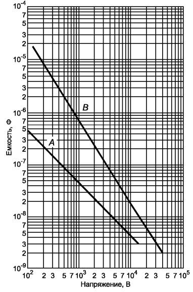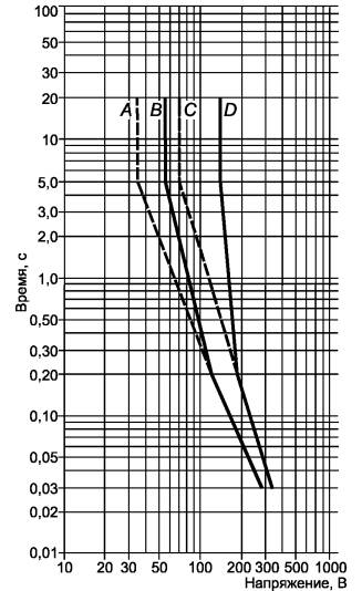 напряжения во влажных условиях; Рисунок 1 - Максимальная длительность кратковременных напряжений на доступных частях при условии единичной неисправности [см. 6.3.2, перечисление а)] б) Уровни тока: 1) 3,5 мА (среднеквадратичное значение) для напряжения синусоидальной формы, 5 мА (пиковое значение) - для напряжения несинусоидальной формы или со смешанными частотами, или 15 мА для напряжения постоянного тока, измеренного по схеме, представленной на рисунке А.1 (приложение А). В качестве альтернативы может быть применена измерительная схема, представленная на рисунке А.2 (приложение А), если частота не превышает 100 Гц. Схему измерения, показанную на рисунке А.4 (приложение А), применяют, если оборудование предназначено для использования во влажных условиях; 2) 500 мА (среднеквадратичное значение) при измерении по схеме в соответствии с рисунком А.3 (приложение А). Это связано с возможностью ожогов при высоких частотах. в) Уровни емкости должны соответствовать уровням, установленным на рисунке 2.