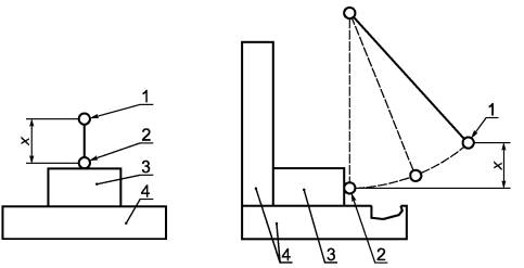 1 - начальное положение шара; 2 - положение шара во время удара; 3 - испытуемый образец; 4 - твердая опорная поверхность Рисунок 4 - Испытание на удар с помощью шара После испытания опасные для жизни части, которые находятся за явно поврежденными окнами или дисплеями, не должны стать доступными, а другие части кожуха должны соответствовать требованиям для основной изоляции. Следующие оборудование и части не подвергают испытанию: а) щитовые измерительные приборы; б) ручное оборудование; в) врубное оборудование; г) компоненты или окна, не образующие часть кожуха. 8.2. Испытание на падение8.2.1. Оборудование, кроме ручного и врубного оборудованияИспытание проводят: а) оборудования массой до 20 кг - при падении углом основания в соответствии с 8.2.1.1; б) оборудования массой более 20 кг, но не более 100 кг - при падении поверхностью основания в соответствии с 8.2.1.2; в) для стационарного оборудования и оборудования массой более 100 кг не требуется никакого испытания. Примечание - Если оборудование состоит из двух или более компонентов, то значение массы относится к массе каждого отдельного компонента. Но если один или несколько компонентов прикреплены к другому компоненту или опираются на другой компонент, то эти компоненты рассматривают как один компонент. Метод испытаний не позволяет опрокидывать оборудование на другую его поверхность вместо падения назад на испытуемую поверхность заданным образом или перекатывать на следующее ребро. Если нижних ребер более четырех, то число падений должно быть равно четырем. 8.2.1.1. Испытание при падении углом основания Оборудование помещают в положении при нормальном применении на гладкую жесткую поверхность из бетона или стали. Одно из нижних ребер поднимают над испытательной поверхностью с помощью деревянной опоры высотой 10 мм под одним углом и деревянной опоры высотой 20 мм под прилежащим углом. Затем оборудование приподнимают над испытательной поверхностью, повернув его вокруг ребра на двух опорах, так, чтобы расстояние от другого угла (соседнего с опорой в 10 мм) и испытательной поверхностью составило (100 ± 10) мм или угол между основанием оборудования и испытательной поверхностью составил 30° (выбирают наименее жесткое условие). Затем оборудованию дают свободно упасть на испытательную поверхность. Падение оборудования осуществляют один раз на каждый из четырех нижних углов при поочередном проведении данного испытания для каждого из четырех нижних краев. 8.2.1.2. Испытание при падении поверхностью основания Оборудование помещают в положении, принятом при нормальном применении, на гладкую жесткую поверхность из бетона или стали. Затем его наклоняют на один из нижних краев, чтобы расстояние между противоположным краем и испытательной поверхностью составило (25 ± 2,5) мм или чтобы угол между основанием и испытательной поверхностью составил 30° (выбирают менее жесткое условие). Затем оборудованию дают свободно упасть на испытательную поверхность. 8.2.2. Ручное и врубное оборудованиеОсуществляют однократное падение ручного и врубного оборудования с высоты 1 м на доску из твердой древесины толщиной 50 мм и плотностью 700 кг/м3, которая плоско лежит на жестком основании, например на бетонном блоке. Падение оборудования выполняют таким образом, чтобы его положение в момент удара соответствовало наиболее жестким усл
