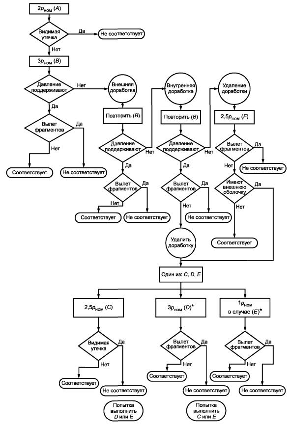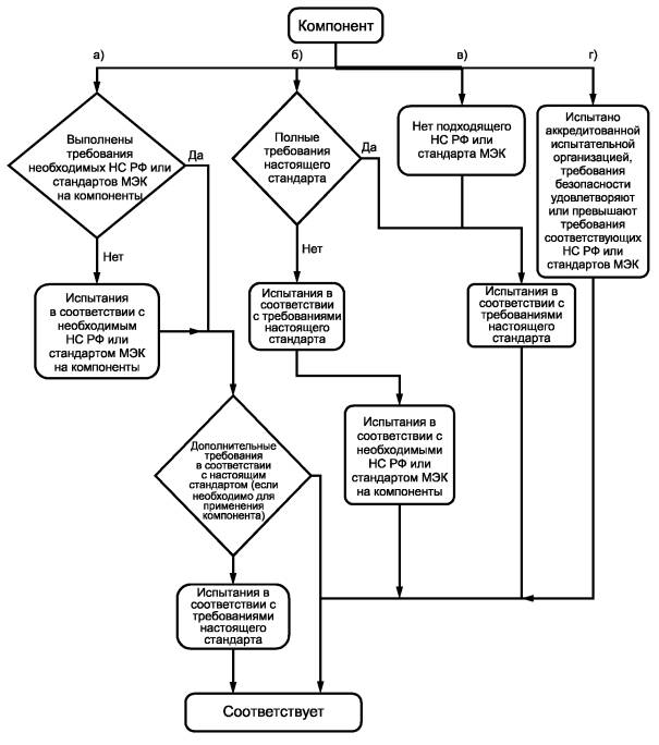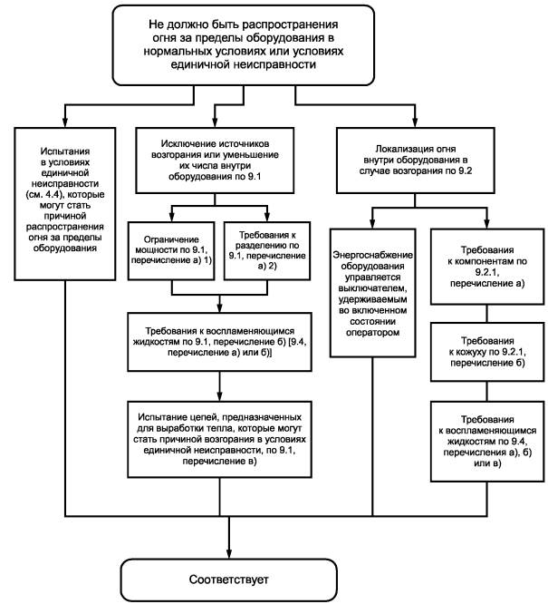 Рисунок 10 - Блок-схема для вариантов соответствия по 14.1, перечисления а), б), в) и г) При этих испытаниях самовосстанавливающиеся устройства должны срабатывать каждый раз, когда возникают условия единичной неисправности, а невосстанавливающиеся - один раз. После испытания восстанавливающиеся устройства не должны иметь повреждений, которые могут помешать их работе при следующем возникновении условий единичной неисправности. 14.4. Держатели плавких предохранителейДержатели плавких предохранителей, заменяемых оператором, не должны допускать доступ к опасным для жизни частям при замене плавкого предохранителя. Соответствие проверяют шарнирным испытательным пальцем [см. рисунок В.2 (приложение В)] без приложения силы. 14.5. Устройства установки напряжения сетиУстройства должны быть сконструированы таким образом, чтобы не произошло случайного перехода от одного напряжения к другому или от одного типа источника питания к другому. Маркировка устройств установки напряжения приведена в 5.1.3, перечисление г). Соответствие проверяют осмотром и испытанием вручную. 14.6. Компоненты высокой надежностиЕсли в условиях единичной неисправности короткое замыкание или разрыв цепи компонента может вызвать опасность, то следует использовать компоненты высокой надежности. Для обеспечения безопасности и надежности при предполагаемом применении компоненты высокой надежности должны иметь конструкцию и размеры, определенные в соответствующем НС РФ или стандарте МЭК на них, а также должны быть испытаны в соответствии с этим стандартом. Их можно считать безотказными в отношении требований безопасности настоящего стандарта. Примечание - К примерам подобных требований и испытаний можно отнести: а) испытания диэлектрической прочности, проводимые для двойной или усиленной изоляции; б) превышение, как минимум в два раза, мощности рассеяния (для резисторов); в) климатические испытания и испытания на долговечность для определения надежности в течение предполагаемого срока службы оборудования; г) импульсные испытания резисторов по ГОСТ Р МЭК 60065. Отдельные электронные устройства, в которых используется электронная проводимость в вакууме, газе или полупроводниках, не считают компонентами высокой надежности. Соответствие проверяют проведением соответствующих испытаний. 14.7. Сетевые трансформаторы, испытуемые не в составе оборудованияСетевые трансформаторы, испытуемые не в составе оборудования (см. 4.4.2.6), должны быть испытаны в тех же условиях, что и внутри оборудования, если они могут повлиять на результаты испытания. Соответствие проверяют испытаниями на короткое замыкание и перегрузку, описанными в 4.4.2.6, после которых проводят испытание по 4.4.4.1, перечисления б) и в). При любых сомнениях, выдержит ли трансформатор другие испытания, описанные в 4.4.4 и 10.2, после установки в оборудование, испытания для этого трансформатора повторяют после его установки. 14.8. Печатные монтажные платыПечатные монтажные платы должны быть изготовлены из материала класса воспламеняемости FV-1 согласно ГОСТ Р 50695 или более высокого класса. Это требование не относится к гибким тонкопленочным печатным монтажным платам, которые содержат цепи с ограничением по мощности, отвечающие требованиям 9.3. Соответствие установленному классу воспламеняемости проверяют изучением соп
