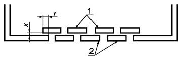 Y - равно удвоенному значению X, но не должно быть менее 25 мм; 1 - полосы перегородки (могут быть ниже основания кожуха); 2 - основание кожуха Рисунок 6 - Перегородки