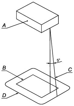 А - часть или компонент оборудования, который рассматривают как источник опасности от огня. Это компонент в целом или часть оборудования, если она не защищена другим способом, или же незащищенная часть компонента, который частично защищен своим корпусом; В - проекция контуров части А на горизонтальную плоскость; С - наклонная линия, которая очерчивает минимальную зону основания и расположение боковых сторон, которые должны быть выполнены в соответствии с требованиями 9.2.1, перечисления б) 1) и б) 2). Эту линию проводят под углом 5° от вертикали в каждой точке периметра А и ориентируют таким образом, чтобы занять максимальную площадь; D - минимальная зона основания, которая должна соответствовать требованиям 9.2.1, перечисление б) 1) Рисунок 7 - Участок основания кожуха, который сконструирован в соответствии с 9.2.1, перечисление б) 1) Таблица 12 - Допустимая перфорация основания кожуха В миллиметрах