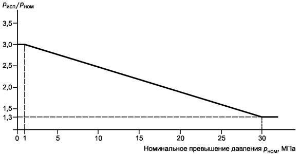 Рисунок 9 - Соотношение между давлением гидравлического испытания и максимальным номинальным рабочим давлением Значение давления увеличивают постепенно до указанного испытательного значения и удерживают при этом значении в течение 1 мин. Образец не должен иметь разрывов, ухудшать свои качества вследствие долговременных пластических деформаций или допускать утечку. Просачивание жидкости через уплотнение во время этого испытания не считают неисправностью, если оно происходит при давлении не менее 40 % требуемого испытательного давления или выше максимально допустимого рабочего давления (выбирают наибольшее значение). Не допускается никакой утечки из содержащих жидкости частей, предназначенных для токсичных, воспламеняющихся или представляющих иную опасность веществ. Если немаркированные части и трубопроводы, которые содержат жидкости, нельзя проверить с помощью гидравлического испытания, то их целостность должна быть проверена с помощью других испытаний, например пневматических испытаний с использованием подходящих средств при том же испытательном давлении, как и для гидравлического испытания. В качестве исключения вышеуказанным требованиям содержащие жидкость части охлаждающих систем должны отвечать соответствующим требованиям ГОСТ Р МЭК 60335-2-35 и ГОСТ Р МЭК 60335-2-41. 11.7.3. Утечка из частей оборудования с низким давлениемУтечка из частей, содержащих жидкости, при пониженном давлении не должна вызывать опасность. См. также 5.4.5. Соответствие определяют проверкой номинальных характеристик частей оборудования, и, в случае необходимости, испытанием частей оборудования давлением жидкости, в два раза превышающим максимальное давление при нормальном применении. Не должно быть никаких утечек, способных привести к опасности. 11.7.4. Устройство защиты от превышения давленияУстройство защиты от превышения давления не должно функционировать при нормальном применении и должно соответствовать требованиям ИСО 4126-1 [17], а также оно должно: а) быть подсоединено как можно ближе к содержащим жидкости частям системы, для защиты которой предназначено; б) быть установлено таким образом, чтобы обеспечить легкий доступ для контроля, обслуживания и ремонта; в) не допускать возможности регулировки без использования инструмента; г) иметь собственное выпускное отверстие, расположенное и направленное таким образом, чтобы выпускаемое вещество не было направлено на человека; д) иметь собственное выпускное отверстие, расположенное и направленное таким образом, чтобы при работе этого устройства не происходило накопление вещества на частях, которые могут стать причиной опасности; е) иметь достаточную пропускную способность, чтобы при отказе регулятора давления в устройстве подводки давление не превысило максимального номинального рабочего давления данной системы; ж) не иметь никакого запорного клапана между устройством защиты от превышения давления и частями, которые предполагается защитить. Соответствие проверяют осмотром и испытанием. 12. Защита от излучения, включая источники лазерного излучения, и защита от звукового и ультразвукового давления12.1. Общие положенияОборудование должно обеспечивать защиту от воздействия вырабатываемого внутри него ультрафиолетового, ионизирующего и микроволнового излучения, от источников ла