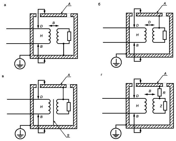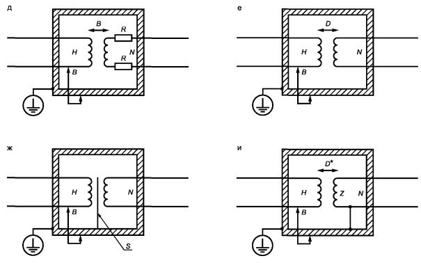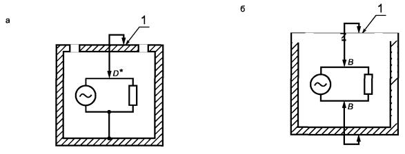 А - нормальные условия; В - условия единичной неисправности Рисунок 2 - Уровень емкости в нормальных условиях и условиях единичной неисправности [см. 6.3.1, перечисление в) и 6.3.2, перечисление в)] 6.4. Защита в нормальных условияхДоступные части оборудования должны быть защищены от возможности стать опасными для жизни одним или несколькими способами, указанными ниже: а) основной изоляцией (см. приложение D); б) кожухами или барьерами; в) импедансом. Кожухи и барьеры должны удовлетворять требованиям прочности, установленным в 8.1. Если кожухи или барьеры обеспечивают защиту с помощью изоляции, они должны соответствовать требованиям основной изоляции. Зазор и путь утечки между доступными частями и частями, опасными для жизни, должны удовлетворять требованиям 6.7 и соответствующим требованиям для основной изоляции. Изоляция из твердых материалов между доступными частями и опасными для жизни частями должна выдерживать испытание напряжением для основной изоляции, установленное в 6.8. Примечание - Требования к толщине изоляции из твердых материалов не предъявляют, если проведены испытания диэлектрической прочности по 6.8. Однако при наличии механических и тепловых нагрузок необходимо принимать во внимание требования, установленные в разделах 8, 9 и 10. Испытания на частичный разряд изоляции из твердых материалов находятся в стадии изучения. Соответствие проверяют: 1) определением по 6.2 и измерениями по 6.3.1 для установления того, что доступные токопроводящие части не являются опасными для жизни; 2) осмотром или измерением зазоров и путей утечки, указанных в 6.7; 3) испытаниями диэлектрической прочности основной изоляции в соответствии с требованиями 6.8; 4) испытаниями жесткости кожухов и барьеров в соответствии с требованиями 8.1. 6.5. Защита в условиях единичной неисправностиДолжна быть обеспечена дополнительная защита для того, чтобы доступные части не стали опасными для жизни в условиях единичной неисправности. Защита должна включать в себя одно или большее число защитных средств, установленных в соответствии с 6.5.1 - 6.5.3, или предусматривать автоматическое отключение источника питания при возникновении неисправности (см. 6.5.4). Соответствие проверяют по 6.5.1 - 6.5.4. 6.5.1. Защитное соединениеДоступные токопроводящие части должны быть подключены к клемме защитного проводника, если они могут стать опасными для жизни в случае единичной неисправности основных защитных средств, определенных в 6.4. Кроме того, такие доступные части должны быть отделены от опасных для жизни частей токопроводящим защитным экраном или барьером, подключенным к клемме защитного проводника. Примечание - Доступные токопроводящие части могут не быть соединены с клеммой защитного проводника, если они отделены от всех опасных для жизни частей двойной или усиленной изоляцией. Соответствие проверяют по 6.5.1.1 - 6.5.1.5. 6.5.1.1. Целостность защитного соединения Целостность защитного соединения должна быть обеспечена с помощью следующих мер: а) Защитное соединение должно состоять из непосредственно подсоединенных структурных частей либо из отдельных проводников, либо из того и другого. Оно должно выдерживать все возможные тепловые и динамические нагрузки до тех пор, пока одно из защитных средств от перегрузки по току, определенных в 9.5, не отключит оборудование от источника питания.