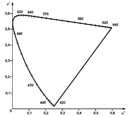Примечание - Цифры на графике - значения длин волн в нанометрах. Рисунок 1 - равноконтрастный цветовой график МКО 1976 3.2.3 разность цветов МКО 1976 L*u*v* [ΔE*uv] (CIE 1976 L*u*v* colour difference): Разность двух цветовых стимулов, определяемая как Евклидово расстояние между координатами L*u*v*; рассчитывают по формуле
