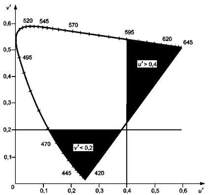 где u1', v'1 и u2', v'2 - координаты одного цвета, см. рисунки 1 и 2. Примечание - Разность цветности Δu' v' имеет приблизительное значение, если яркость неоднородна или объекты не расположены рядом (см. 3.2.2). 3.2.5 доминирующая длина волны цветового стимула λd (dominant wavelength of a colour stimulus λd): Длина волны излучения монохроматического стимула, который при аддитивном смешивании в определенных пропорциях с излучением стандартного ахроматического стимула дает цветовое равенство с излучением рассматриваемого цветового стимула. Примечание - Для пурпурных цветов доминирующая длина волны заменяется дополнительной длиной волны [35] (845-03-44). 3.2.6 одинаковая доминирующая длина волны (same dominant wavelength): Два цвета имеют одинаковую доминирующую длину волны, если разность между оттенками каждого цвета мала. 3.2.7 спектральные предельные цвета (spectrally extreme colours): Спектральные предельные цвета - предельный синий и предельный красный цвет. Примечание - Предельный синий - любой цвет с v'< 0,2. Предельный красный - любой цвет с u' > 0,4. Предельные области цветов выделены на графике, приведенном на рисунке 2.