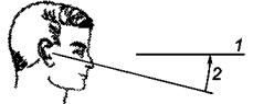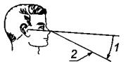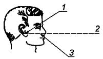 1 - козелок; 2 - Франкфуртская плоскость; 3 - нижний выступ глазной впадины Рисунок 5 - Франкфуртская плоскость Орбита - впадина в черепе, в которой расположен глаз. Козелок - выступ хряща, расположенного в ушной раковине ниже слухового отверстия. 3.3.6 угол наблюдения (gaze angle): угол между Франкфуртской плоскостью и плоскостью, образованной зрачками и визуальным объектом, см. рисунок 6.