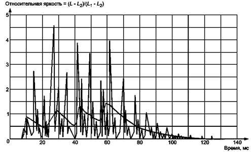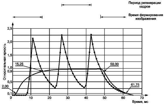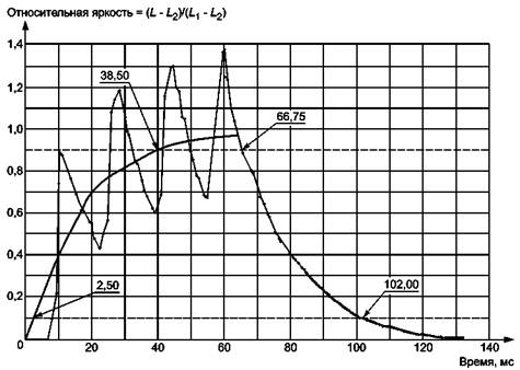1 - горизонтальная плоскость; 2 - угол наклона головы Рисунок 7 - Угол наклона головы Примечание - Удовлетворительный диапазон угла наклона головы - приблизительно от 0° до 20°. 3.3.8 диапазон угла визирования (viewing angle range): Коническая область, начинающаяся в пикселе, включающая направления визирования, удовлетворяющие всем техническим требованиям [145]. 3.4 Технология дисплея (display technology)3.4.1 коэффициент заполнения (fill factor): Отношение площади пикселя, отведенной для отображения информации, к полной площади пикселя (ГОСТ Р ИСО 9241-3, пункт 2.15). 3.4.2 эмиссионный дисплей (emissive display): Дисплей с собственным источником (ами) света [145]. Примечание - Этот свет может излучаться непосредственно одним или более числом внутренних источников света, модулируемых преобразователем. 3.4.3 шкала яркости (grayscale): Считают, что дисплей имеет шкалу яркости, если возможно выводить изображения, требующие более двух уровней яркости [145]. 3.4.4 время формирования изображения (image formation time): Время, за которое уровень относительной яркости визуального объекта изменится от 0,1 до 0,9. Примечания 1 Относительная яркость равна где Lmax и Lmin - усредненные по времени самые высокие и самые низкие состояния яркости соответственно; L - мгновенная яркость. 2 Относительная яркость отфильтрована для устранения временных вариаций, которые не обнаруживаются визуально. Время формирования изображения в миллисекундах, приведенное к амплитудным значениям, представлено в таблице 1. Рисунок 8 - Время формирования изображений Примечания 1 На рисунке 8 проиллюстрирован типичный случай формирования изображения; 2 Допускается задняя подсветка осциллографа с постоянной яркостью (после предварительной фильтрации сигнала дискретизацией с частотой 4 × 103 отсчетов в секунду); 3 На рисунке 8 показано время формирования изображения. Линия с точками представляет непрофильтрованное изменение во времени яркости, нормированное относительно единицы. Линия без точек - первая профильтрованная линия, исключающая частоты, являющиеся психофизически значимыми. Время формирования изображений оценивают по этой линии. Примем согласно рисунку 8 t1 = 2,00 мс - время, зарегистрированное на уровне 0,1 максимума яркости при увеличении яркости; t2 = 15,25 мс - время, зарегистрированное на уровне 0,9 максимума яркости при увеличении яркости; t3 = 50,00 - время, зарегистрированное на уровне 0,9 максимума яркости при уменьшении яркости и t4 = 61,75 мс - время, зарегистрированное на уровне 0,1 максимума яркости при уменьшении яркости. Время формирования изображения: t2 – t1 + (t4 - t3) = 25 мс. Изменение яркости во времени выбирается так, чтобы при 4 × 103 отсчетов в секунду точность была равна ±0,5 мс; 4 Для дисплеев на плоских панелях с очень быстрыми электрооптическими процессами период регенерации равен времени формирования изображения. Таблица 1 - Время формирования изображения