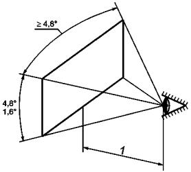 1 - позиция наблюдения; 2 - дисплей; 3 - горизонтальная поверхность (например стол) Примечание - Угол а идентичен углу А в соответствии с ГОСТ Р ИСО 9241-3, пункт 6.1.2. Рисунок 9 - Угол наклона экрана α 3.4.11 панель малых размеров (small-size panel): Плоская панель с наименьшим угловым размером от 1,6° до 4,8° при проектном расстоянии наблюдения и с наибольшим угловым размером не менее 4,8° при проектном расстоянии наблюдения, см. рисунок 10.