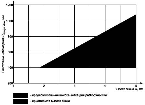 5 Руководящие принципыРабочее место с ВДТ - интегрированное целое, включающее в себя плоскопанельный дисплей, аппаратные средства (клавиатуру, координатно-указательные устройства и т.д.), окружающую среду, структуру задания и другие факторы. Характеристики плоской панели должны рассматриваться не как изолированный набор визуальных требований, а в связи с другими элементами системы. Конструктивные элементы аппаратуры часто взаимодействуют так, что оптимизация одного элемента ухудшает характеристики другого. Например, в многоцветных панельных дисплеях существует альтернатива между палитрой доступных цветов и постоянством цветопередачи в зависимости от направления наблюдения. Для достижения приемлемого баланса необходим компромисс. Для визуальной эффективности плоского дисплея в условиях окружающей среды качество изображения должно быть значительно выше пороговых значений для отдельных стимулов. Эти рекомендации учтены в настоящем стандарте. Большинство рекомендаций основано на рабочих характеристиках, некоторые - учитывают комфорт пользователя. Программное обеспечение и элементы аппаратных средств не должны оцениваться раздельно. Аппаратура должна обеспечивать возможность кодирования и формирования знаков. 6 Требования к рабочим характеристикамЦелью настоящего стандарта является разборчивость, удобочитаемость и удобство использования ВДТ, основанных на плоских панелях, см. раздел 9 в части соответствия настоящему стандарту и раздел 3 - в части определений. Примечание - Термины «разборчивость» и «удобочитаемость» - по ГОСТ Р ИСО 9241-3. 7 Технические требования и рекомендации7.1 Проектное расстояние наблюденияПроектное расстояние наблюдения Ddesjgn weiv должно быть не менее 400 мм, однако для некоторых применений (например изображение метки клавиши сенсорных экранов) проектное расстояние наблюдения может быть сокращено до 300 мм. Для офисных работ в соответствии с ГОСТ Р ИСО 9241-3 необходимо следовать рекомендациям 5.1. Проектное расстояние наблюдения (ГОСТ Р ИСО 9241-3). Конструкция дисплея должна позволять использовать его на рабочем месте при проектном расстоянии наблюдения. Если выполняемая работа требует большого объема чтения, конструкция, программные приложения и рабочее место должны обеспечивать наблюдение дисплея с расстояния, при котором высота знака у набора символов соответствует 7.6: высота знака - от 20' до 22' (от 30' до 35' - для азиатских знаков). Зависимость «расстояние наблюдения - высота знака» показана на рисунке 11.