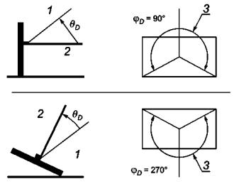 Направления испытаний представлены на рисунке 14. Данные, использованные в примерах на рисунках 14, 30 и в таблицах 33, 35, идентичны. 1) Для настоящего стандарта число направлений испытаний ограничено шестью с целью сделать испытания экономичнее и выполнять их при помощи технологического испытательного оборудования, имеющегося в настоящее время. При ограничении испытаний только шестью направлениями возможность полностью описать работоспособность плоской панели ограничена. С точки зрения эргономики полезно оценивать плоские панели более чем шестью направлениями испытаний по 7.14 Яркость дисплея; 7.15 Контраст; 7.17 Отражения; 7.19 Однородность яркости; 7.25 Установка цветов по умолчанию и 7.27 Разность цветов. Приемлемый диапазон азимутального угла и диапазон угла наклона для анализа зависят от поставленной задачи, расстояния наблюдения, размера экрана и числа пользователей, работающих одновременно. 1 - альбомная ориентация, φD = 90°, θD = 0° и φC = 63,4° (таблица 33); 2 - альбомная ориентация, φD = 270°, θD = 0° и φC = 63,4° (таблица 34); 3 - портретная ориентация, φD = 270°, θD = 10° и φC = 71,6° (таблица 35) Рисунок 14 - Примеры направлений испытаний Примечания 1 Ключевыми факторами, влияющими на предпочтения пользователей на проектный азимут φD, являются блики, яркость и контраст. Для изотропных эмиссионных дисплеев значение φD обычно равно 90° (пользователи пытаются избегать отраженных бликов, вызванных внешним освещением). Для изотропных отражающих дисплеев значение φD обычно равно 270° (пользователи пытаются максимально увеличить яркость). Для анизотропных дисплеев φD - угол, при котором контраст и яркость достаточно велики, но отраженные блики достаточно малы (значение φD зависит от технологии изготовления дисплея и внешней освещенности). 2 Для одиночного пользователя значение θrange больше 80° не дает улучшения. Для всех дисплеев и текстового материала по мере увеличения угла наклона знаки представляются геометрически короче. Знак, наблюдаемый под углом 40°, воспринимается приблизительно на 25 % короче. Например, знак 16', наблюдаемый под углом наклона 40°, укорачивается до значения 12'. Не следует требовать изотропии для больших углов наклона, так как текстовый материал при просмотре ухудшается в зависимости от угла наклона. Случаи, когда несколько наблюдателей используют один дисплей при направлении просмотра вне конуса 80°, а искажение знака несущественно, в настоящем стандарте не рассматриваются. 3 Диапазон угла наклона θrange выбран так, чтобы обеспечить использование дисплея без изменения положения головы пользователя. Минимальный диапазон угла наклона θrange основан на комфортности чтения и зависит от размера панели и расстояния наблюдения. Максимальный диапазон угла наклона зависит от разборчивости текста для одиночного пользователя. 7.3 Проектная освещенность экранаПоставщик должен определить проектную освещенность экрана ES. Для эмиссионных дисплеев значение ES должно быть от 250 до 750 лк. Для прозрачноотражающих и отражающих дисплеев поставщик указывает минимальную освещенность, при которой дисплей соответствует требованиям к яркости по 7.14 Яркость дисплея. Если плоская панель ВДТ спроектирована для прямой позы сидящего пользователя, то допускается освещенность экрана, установленная в ГОСТ Р ИСО 9241-3, Е = [250 + (250 cos α)] лк, где α - угол поворота экрана (см. 3.4.10 Опред