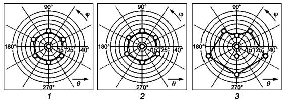 Рисунок 12 - Диапазон направлений наблюдения Стрелки на рисунке 12 указывают возможные направления движения головы пользователя. Определены четыре класса диапазонов направления наблюдения Classviewing - I-IV. Диапазон направления наблюдения зависит от размеров области наблюдения, расстояния наблюдения и числа пользователей, которые должны изменять положение головы для получения приемлемой четкости и других визуальных характеристик. В настоящем стандарте определены критерии направления наблюдения для различных параметров, таких как контраст и различия однородности цветности. Чтобы сделать возможным эргономическое проектирование, производитель должен указать в руководстве для пользователя класс дисплея или аналогичный Classviewing. Примечание - Согласно определению значения θD могут быть только в диапазоне 0° - 90°. Конус наблюдения θrange находится в диапазоне 0° - 180°. Проектный азимутальный угол φD составляет 90°, если поставщик предусматривает, что верх экрана будет ближе к глазам пользователя, и 270° - если низ экрана будет ближе к глазам пользователя, см. рисунок 13. 1 - линия визирования; 2 - нормаль; 3 - азимутальный диапазон. Рисунок 13 - Азимутальный диапазон Для испытаний используют шесть направлений, см. 8.4.1 Направления испытаний1). Для простоты понимания характеристики четырех классов диапазона направления обзора Classviewng определены в таблице 7: Таблица 7 - Классы диапазона направления обзора Classviewing