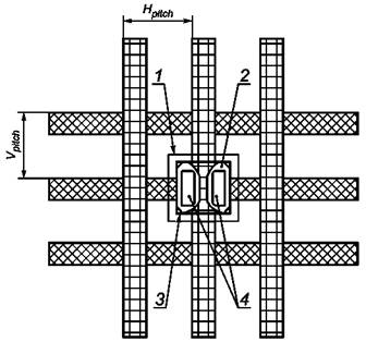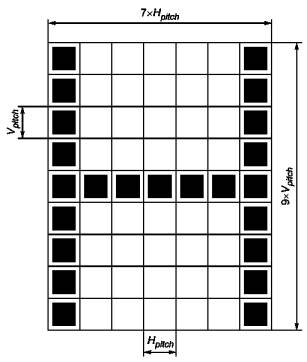 Рисунок 33 - Пример исходных участков измерения для дисплея с плоской панелью 640 × 480 пикселей Примечания 1 Заключение «визуально хуже» может подаваться голосом недвусмысленно. Цель состоит в том, чтобы найти места, визуально различимые для среднего наблюдателя в условиях внешнего освещения. Когда заключение делает обученный персонал в условиях темной комнаты, порог обнаружения бывает существенно ниже, чем для среднего наблюдателя. Поэтому риск того, что средний наблюдатель обнаружит худшее место, которое в испытательной лаборатории не будет обнаружено, бывает незначительным. 2 Большая часть плоских панелей, соответствующих настоящему стандарту, не имеет участков с заключением «визуально хуже». 3 При проведении автоматического тестирования визуально худшее место может быть найдено, например, сканированием всего экрана с шагом 1°. 8.4.3 Место измерения и таблица мест и направлений измерений При проведении измерений иногда необходима полная таблица мест и направлений измерений для некоторых параметров. Остальные параметры оценивают для подмножества мест измерения и только при проектном направлении наблюдения. Каждое конкретное требование определяют отдельно для каждого измерения. 8.5 Комбинированное измерение для анализа формы знакаОпределения, используемые в настоящем пункте, содержатся в 3.5 Буквенно-цифровые символы. Измеряют вертикальный шаг Vpitch и горизонтальный шаг Hpitch. Для увеличения точности измеряют расстояние от передней кромки (или другой согласованной точки) пикселя до такой же согласованной точки ряда пикселей и делят это расстояние на число пикселей, см. рисунок 34. Например, если панель имеет 480 строк пикселей, то измеряют расстояние от первого пикселя до той же точки последнего пикселя (отрезок из 479 пикселей) и делят на 479: Hpitch = измеренное расстояние /479. В этом примере у дисплея 480 столбцов пикселей. Расстояние от крайнего левого до крайнего правого столбца измеряют и делят на 479.