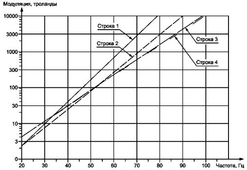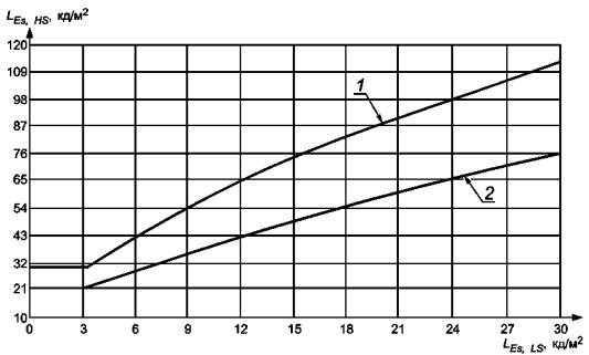 где n = CL-1...CL-7, HL-1...HL-7, LL-1...LL-7. Требование к яркости связано с контрастом (см. 7.15 Контраст, (22). В большинстве случаев под требованием к контрасту подразумевают более высокую яркость, например 35 кд/м2. Когда яркость ниже 35 кд/м2 контрастная модуляция должна быть больше 0,5. Графическое представление уравнения (22) показано на рисунке 18.