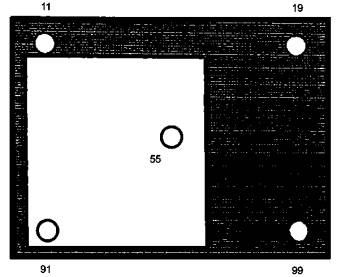 Примечание - Процедура, предусмотренная в 8.7.19 Однородность яркости, предусматривает измерение экрана только в трех положениях. Однако эта процедура распространяется на весь экран, потому что 8.4.2.4 Дополнительные участки предусматривает дополнительные требования в выборе трех положений, распространяющихся на весь экран. Не должно быть непреднамеренного изменения яркости изображения. На рисунке 25 приведен пример изображения, которое может представлять зависимое изменение яркости при некоторых технологиях изготовления панели. Круги представляют места оцениваемых участков и не являются изображением. Яркости в местах 91,55 должны иметь один уровень, а в местах 11, 19 и 99 - другой уровень. На некоторых панелях яркость в месте 11 будет представляться более высокой, чем в местах 19 или 99. Темные/яркие поверхности могут быть обратимы, и подобные явления могут быть заметны. Существует много вариантов этого эффекта.