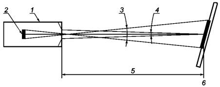 1 - фотометр; 2 - фоточувствительный элемент; 3 - поле обзора = поле зрения = угловой размер рассматриваемого объекта; 4 - приемный конус. Угол, образованный входным зрачком прибора на рабочем расстоянии; 5 - рабочее расстояние. Расстояние между передней линзой прибора и рассматриваемым объектом, который прибор может сфокусировать; 6 - EUT = испытуемое оборудование (см. 3.1.4) Рисунок 27 - Понятия, используемые в требованиях к измерительному прибору Таблица 19 - Требования к фотометрам и их типичные характеристики