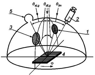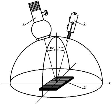 1,3 - диффузные источники света; 2 - точечный фотометр с полем зрения от 0,5° до 2°; 4 - эталон поверхности диффузного отражения; 5 - источник света для испытаний зеркального отражения Примечание - Фотометр находится в плоскости, которая является ортогональной к плоскости, содержащей центральную линию диффузных источников освещения под углом θlm относительно нормали к поверхности эталона. Источник света для испытания зеркального отражения находится в той же плоскости, что и фотометр. Угол θSLg между направлением источника света для испытания зеркального отражения и нормалью к поверхности эталона. Рисунок 28 - Аксонометрическое представление испытательной системы с приблизительно диффузными источниками освещения 8.3.4 Специальные калибровки 8.3.4.1 Измеритель яркости Измеритель яркости должен быть откалиброван в соответствии с государственными эталонами, проверен по повторяемости в требуемом диапазоне яркости и чувствительности к поляризации света. Неопределенность по отношению к государственным эталонам может быть до 5 %. Неопределенность повторяемости в требуемом диапазоне яркости следует поддерживать менее 1 %, но для некоторых приборов допускается до 4 %. Примечание - Калибровку проводят или в испытательной лаборатории или в лаборатории калибровки. 8.3.4.2 Зеркальные источники света (источники света, применяемые при измерении зеркального отражения) Источники света должны быть откалиброваны по: - устойчивости в течение конкретного времени измерений; - пространственной однородности в пределах выходного окна. Измерения проводят в лаборатории и по измеренным значениям вычисляют неопределенность выходной яркости источников. Примечание - Калибровку проводят или в испытательной лаборатории или в лаборатории калибровки. 8.3.4.3 Диффузное освещение, реализованное с использованием двух источников света Если диффузное освещение реализовано с использованием двух источников света, то должны быть приняты следующие дополнительные меры. 8.3.4.3.1 Расположение Источники яркости и точечный фотометр располагают, как показано на рисунке 29. Точечный фотометр устанавливают в плоскости, ортогональной к плоскости, определяемой центрами апертур двух источников и рассматриваемого объекта (поле зрения 1° на поверхности эталона диффузного отражения), как показано на рисунке 29. На этом рисунке показаны два источника, расположенные под углом 45°. ЖК-дисплеи могут иногда быть чувствительны к этому углу. Если конкретный тип панели не проходит испытания под углом 45°, испытания повторяют под углом 30°. Если тип испытаний панели выбран, то это фиксируют в отчете.